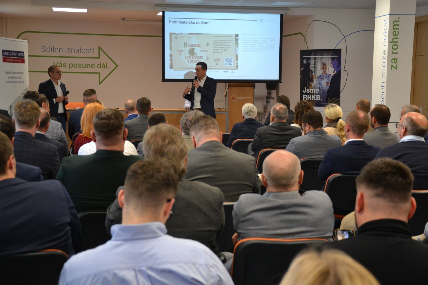 Téměř 70 podnikatelů a podnikatelek z členských firem RHKB dorazilo v úterý 21. dubna na setkání s hejtmanem Jihomoravského kraje a kandidátem na předsedu KDU-ČSL Janem Grolichem a ředitelem brněnské pobočky Národní rozvojové banky Alešem Trnkou.